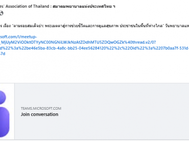 ด่วน!!! ประกาศแจ้งช่องทางการเข้าร่วมประชุมวิชาการออนไลน์ วันพยาบาลแห่งชาติ 21 ตุลาคม 2568 เนื่องจากมีผู้ลงทะเบียนเข้าร่วมเทิดพระเกียรติสมเด็จย่า จำนวน 7345 คน จึงไม่สามารถส่งแจ้งช่องทางการเข้าประชุมท่างเมล์ได้ สมาคมพยาบาลแห่งประเทศไทย ส่งลิ้งค์ห้องประชุมวิชาการออนไลน์ เรื่อง “ตามรอยสมเด็จย่า: พระเมตตาสู่การช่วยชีวิตและการดูแลสุขภาพ ประชาชนในพื้นที่ห่างไกล” วันพยาบาลแห่งชาติ 21 ตุลาคม 2568 วันอังคารที่ 21 ตุลาคม พ.ศ. 2568 เวลา 08:30 – 16:00 น.ห้องประชุม เปิดตั้งแต่เวลา 7.30 น. https://teams.microsoft.com/l/meetup-join/19%3ameeting_NGJiZjc2NjMtMGExYy00ZTYwLTg1YzUtYTk4MTA5Y2FhNTZi%40thread.v2/0?context=%7b%22Tid%22%3a%22be46e5ba-83cb-4a8c-bb25-04ee56284120%22%2c%22Oid%22%3a%2207b0aa7f-531d-4505-8e15-413c556fd976%22%7d รหัสการประชุม: 450 308 196 584 7รหัสผ่าน: SL6Kf27o ขั้นตอนการเข้าประชุมผ่าน Microsoft Teamshttps://drive.google.com/drive/folders/1rWs4oYqRE1m_CC-elKAJMBiFYdjFI6Og?usp=sharing กรณีเข้าห้องประชุมผ่านอุปกรณ์ โทรศัพท์มือถือ หรือ tablet กรุณาติดตั้งแอปพลิเคชัน Microsoft teams ก่อน กดลิ้งค์ สำหรับผู้ที่ลงทะเบียนล่วงหน้า […]