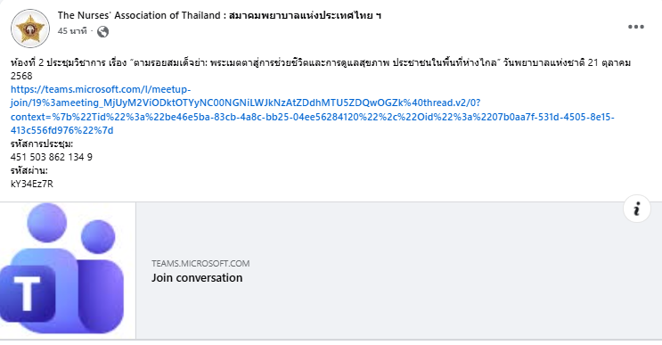 ห้องที่ 2 ประชุมวิชาการ เรื่อง “ตามรอยสมเด็จย่า: พระเมตตาสู่การช่วยชีวิตและการดูแลสุขภาพ ประชาชนในพื้นที่ห่างไกล” วันพยาบาลแห่งชาติ 21 ตุลาคม 2568