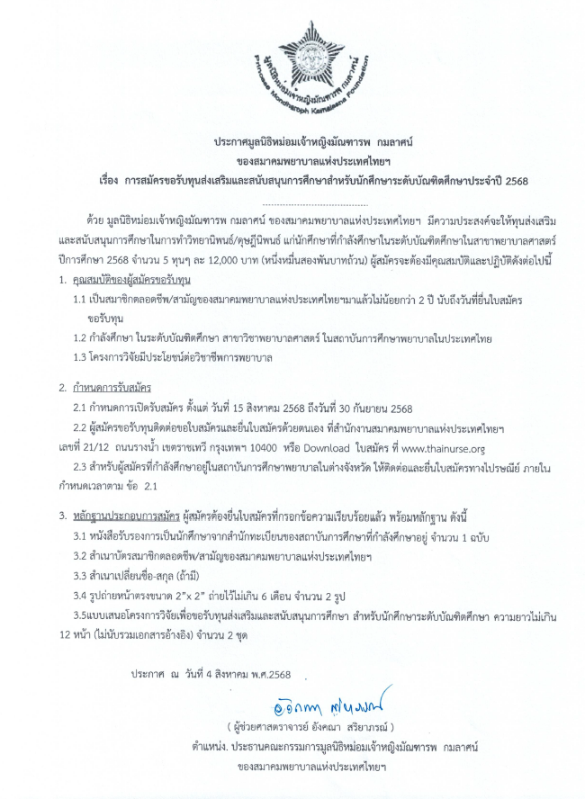 ประกาศมูลนิธิหม่อมเจ้าหญิงมัณฑารพ กมลาศน์ ของสมาคมพยาบาลแห่งประเทศไทย เรื่อง การสมัครขอรับทุนส่งเสริมและสนับสนุนการศึกษาสำหรับนักศึกษาระดับบัณฑิตศึกษาประจำปี 2568